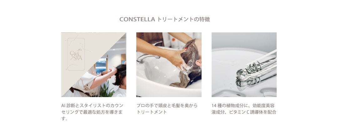 「CONSTELLA」は、現代社会におけるストレスや紫外線、スタイリングなどによる髪の酸化ダメージに特化し、頭皮・毛髪を外部&内部から補修するヘアケアメニューを、美容師によるカウンセリングと“業界初”のAIパーソナル診断によって、それぞれの髪の状態に最適なオーダーメイドで提案するトリートメントシステムです。 至極のヘアケアメニューを「GrandStory SALON 中目黒」でぜひご体験ください。
