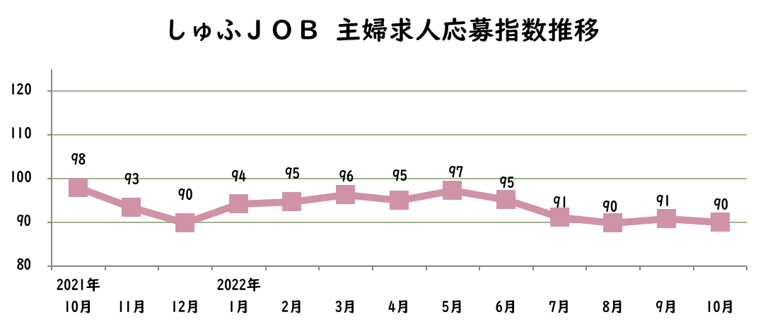 | 【調査概要】 元データ:しゅふJOBに掲載された仕事情報数と求人応募者数 計算手法:2017年の年間応募率(月間データの加重平均)を基準値100として設定。各集計月の応募率を割り出し、2017年の年間平均応募率との差を算出。算出した数字に100を乗した数をさらに基準値100より減算した数がその月の応募指数。 <例:2017年の年間求人応募率と集計月の応募率との差が5ポイントだった場合> ※求人数・応募者数・応募率の実数値は非公表 ※本リリースの引用の際は、 |