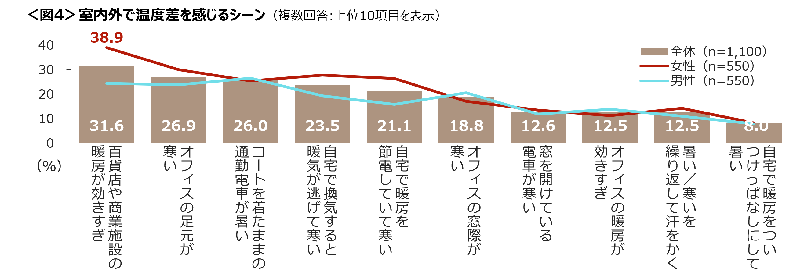 室内外で温度差を感じるのは「百貨店や商業施設の暖房が効きすぎ」が31.6%で最も高い。 <図4>