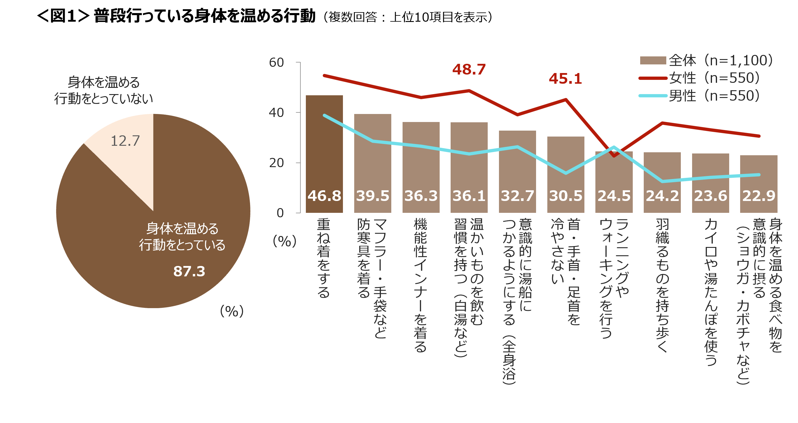 身体を温める行動をとっている人は87.3%。「重ね着をする」「マフラー・手袋など防寒具を着る」「機能性インナーを着る」が上位にあがる。<図1>