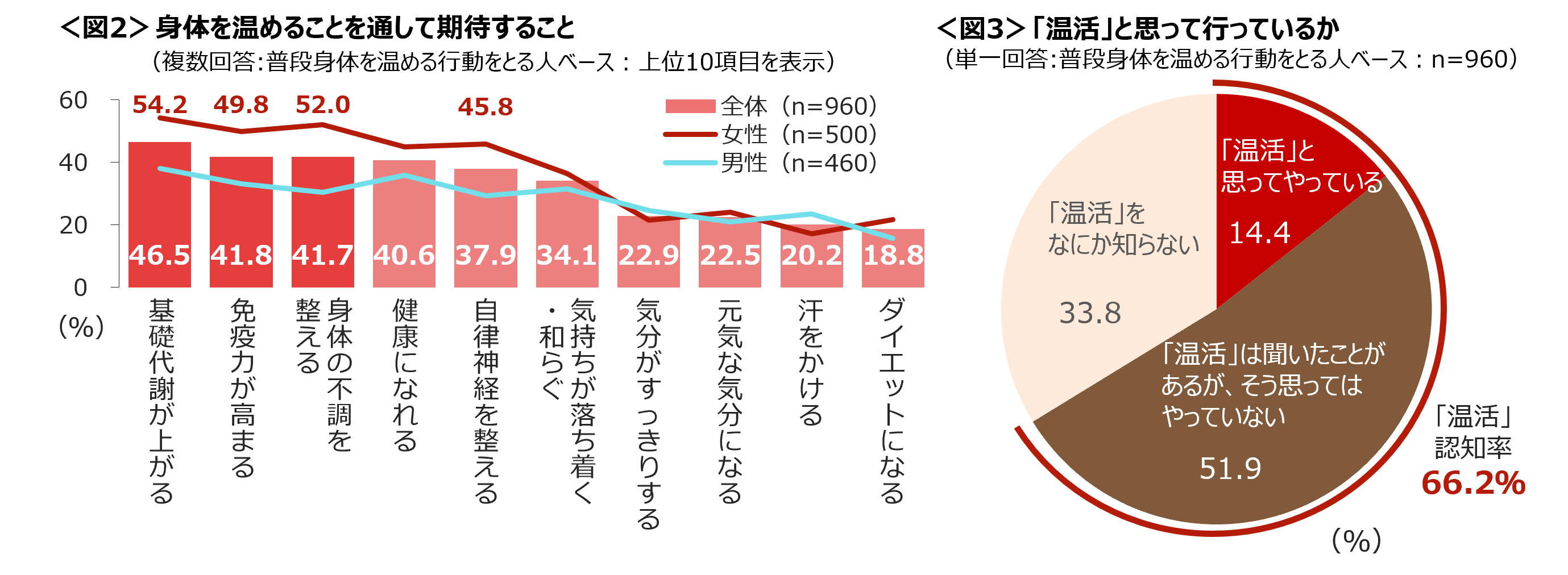 「基礎代謝が上がる」「免疫力が高まる」「身体の不調を整える」が、身体を温めることを通して期待している効果の上位にあがる。<図2>