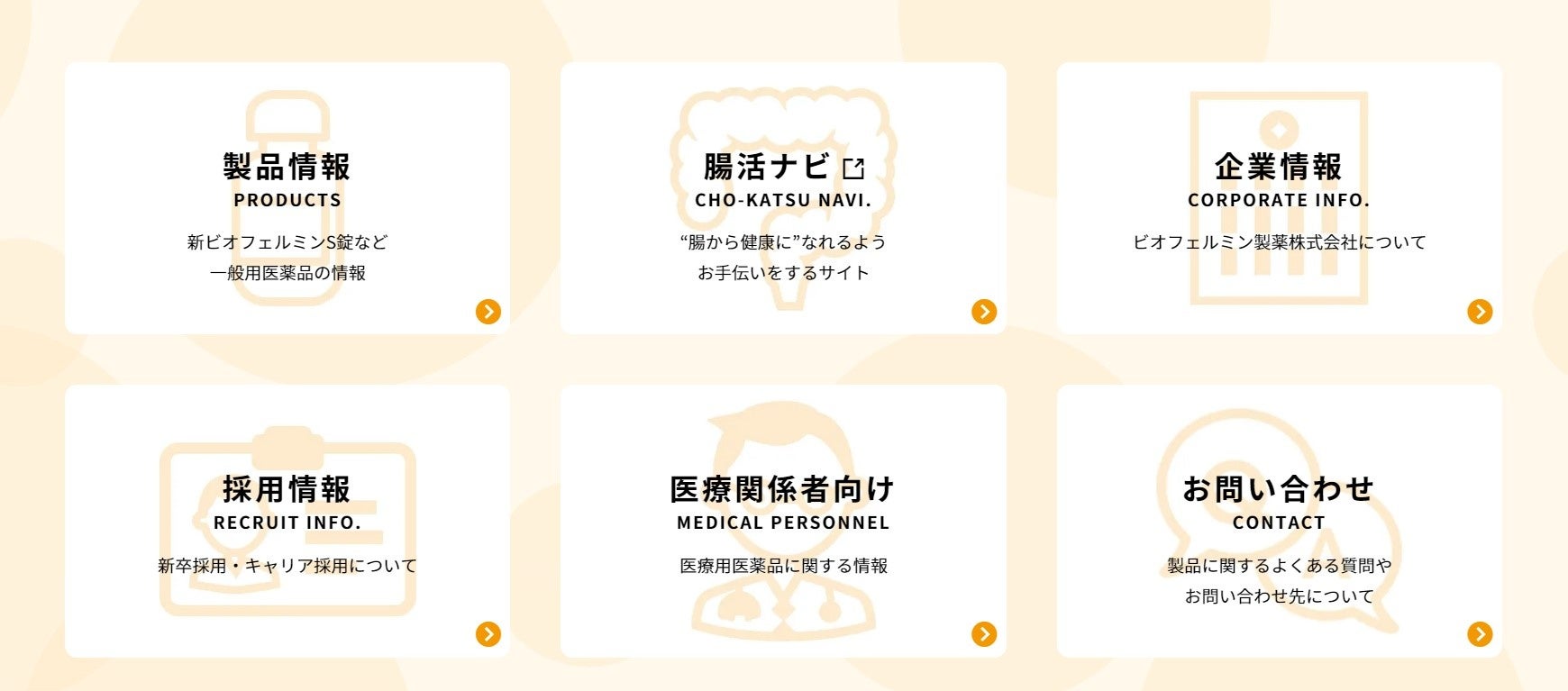 ◆サイトのトップページに、「製品情報」「腸活ナビ」「企業情報」「採用情報」「医療関係者向け」「お問い合わせ」の6つの情報の入り口を配置しました。