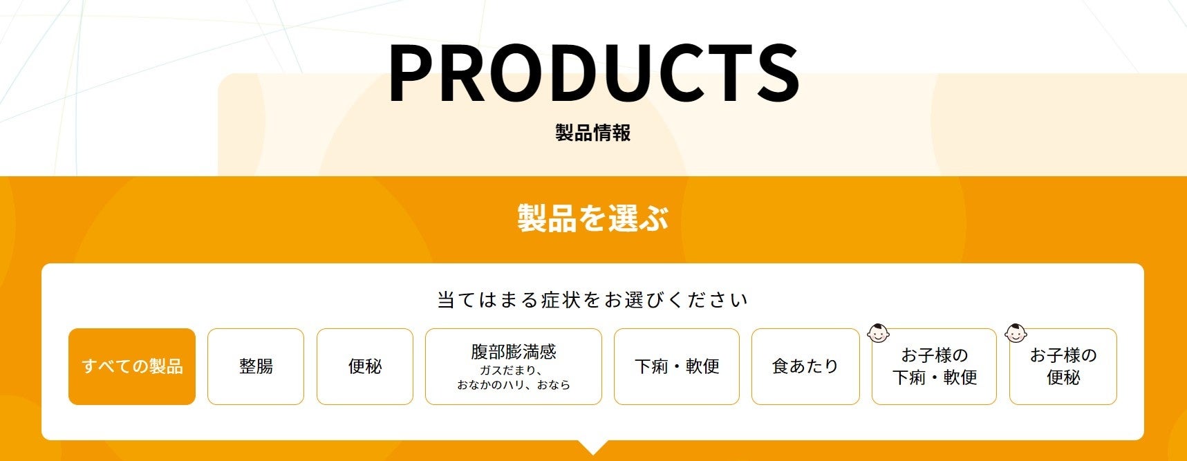 ◆「製品情報」ページでは、「整腸」「便秘」「腹部膨満感」「下痢・軟便」「食あたり」「お子様の下痢・軟便」「お子様の便秘」など、あてはまる症状を選択することで、該当製品が選べる機能を追加しました。