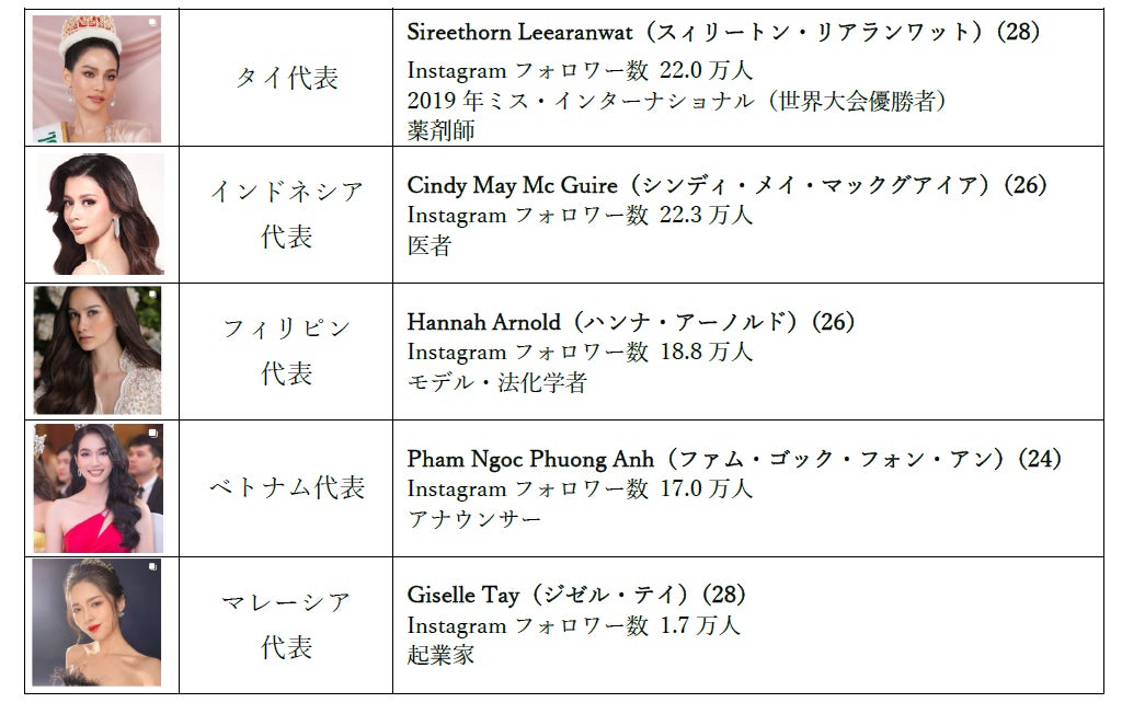 ・2014年から、ミス・インターナショナル代表は、観光庁長官より「ミス・ビジットジャパン(VJ)観光特使」に任命されており、日本の観光振興活動に貢献。各国・地域代表は自身のSNSで日本の情報を積極的に発信している。それぞれの国・地域において、特に女性消費者市場に向けた情報発信で影響力のある存在。大会期間中のSNS・メディア効果は、投稿数 約1万3,000、「いいね!」数600万、フォロワー数 約250万(2019年実績)。