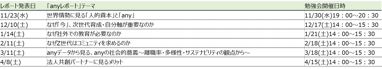 社外面談サービスで企業導入実績豊富な株式会社OVER20&Company.がプレ社会人向けに提供する「パーソナル・ビジョンや自分軸の言語化をサポートする教育プログラム」。受講者は約1か月にわたるオンラインプログラムの中で、世界各国から参加するプレ社会人とディスカッションし、またプロメンターとのマンツーマンセッションを通じ、ブレない軸を言語化する。次世代人的資本への投資に賛同した企業・組織・個人がanyに参画。