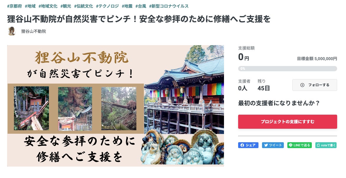- タイトル「狸谷山不動院が自然災害でピンチ!安全な参拝のために修繕へご支援を」
