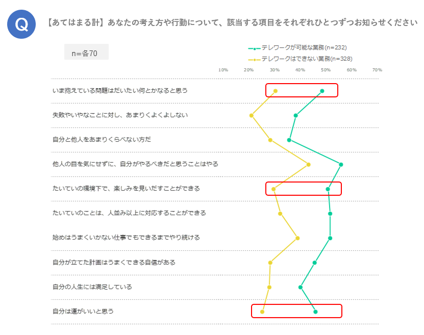 そこで、テレワークが『可能な業務』『できない業務』や、職種別にエンゲージメントや性格傾向について調査結果を比較しました。