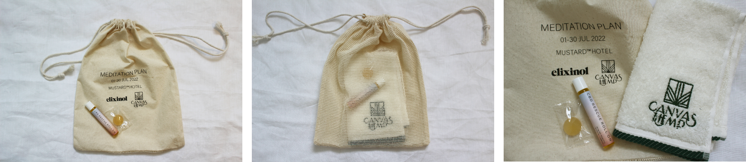 今回のプランでは、スタイレムが展開する衣料・雑貨ブランド「CANVAS HEMP®︎」がマスタードホテルのためにオリジナルで製作した寝具を実際に体験が可能です。また、ヘンプ素材のハンドタオルや、初めてのCBD製品としても取り入れやすいエリクシノールのCBDロールオン、CBDグミなど、3,000円相当のオリジナルヘンプノベルティが特典としてついてきます。さらに、隣接するreloadに4月に開業したIGNITE YOGA STUDIOによるヨガスタジオ「studio s」の動画瞑想レッスンを限定でご視聴いただけます。パーソナルなホテルという空間で心身ともにリラックスして自身と向き合う時間として過ごせます。スーペリアダブルとスーペリアツインの2客室限定で、各客室最大2名までご利用可能です。