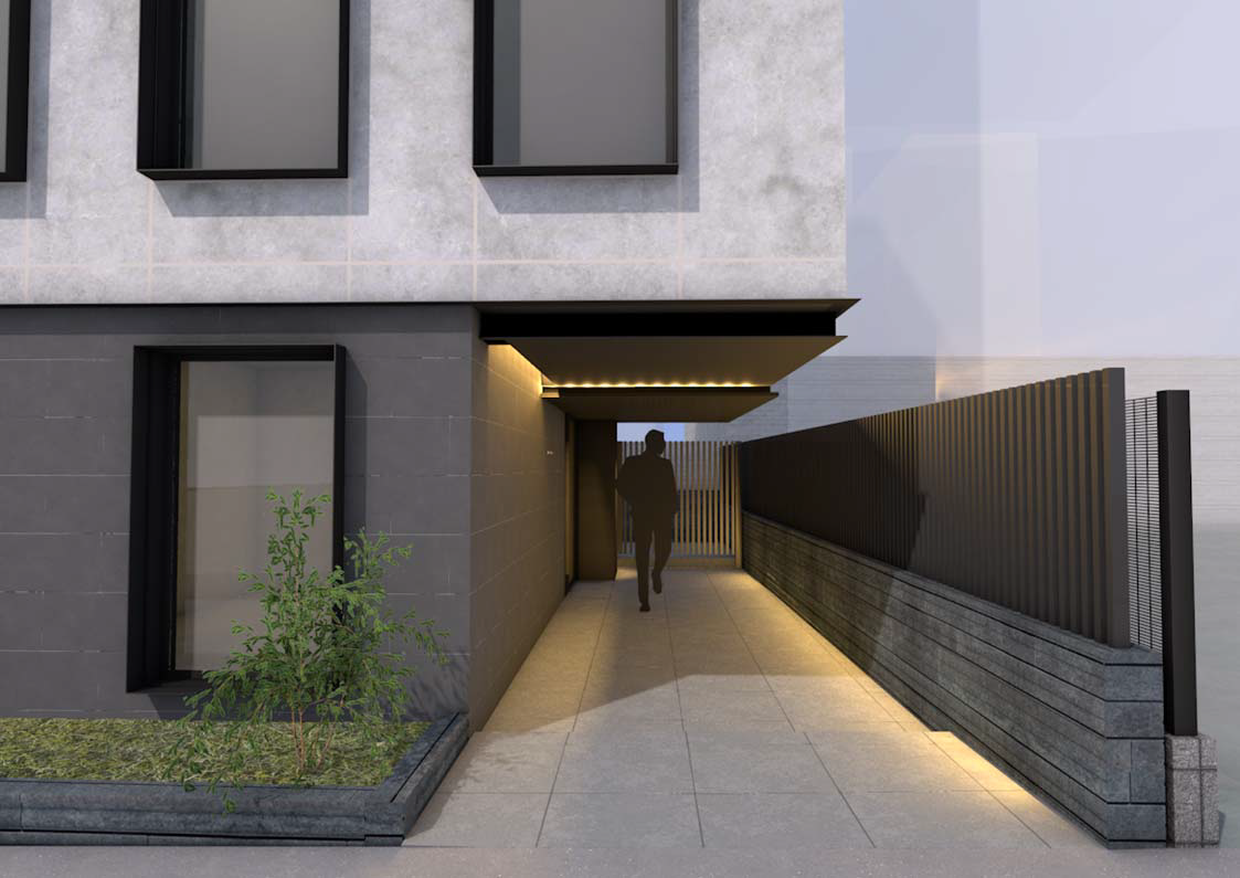 また、計画地は東急目黒線「不動前」駅から徒歩圏内にあり、学校に囲まれた住宅街に存在しています。静かな街並みに溶け込みながらも、規則的に並ぶ開口が、集合住宅特有の単調なファサードとは異なる印象を持たせ、素材感・色調に高級感のあるファサードを目指しました。