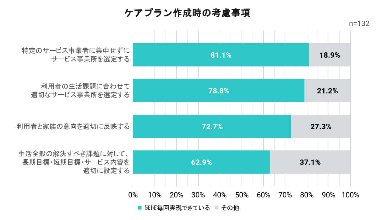 ケアプラン作成時の考慮事項について、ほぼ毎回実現できている割合の高いものは、「特定のサービス事業者に集中せずにサービス事業所を選定する(81.1%)」、「利用者の生活課題に合わせて適切なサービス事業所を選定する(78.8%)」、「利用者と家族の意向を適切に反映する(72.7%)」となった。対して、「生活全般の解決すべき課題に対して、長期目標・短期目標・サービス内容を適切に設定する」は62.9%と、比較的低い結果となった。