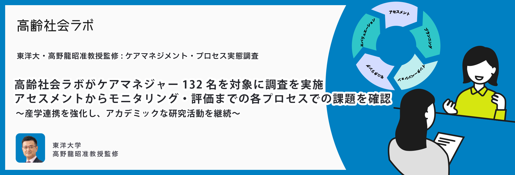 今回の調査に関連した、高野准教授によるコラムを当社運営の介護事業の経営者・管理者向け情報サイト「介護経営ドットコム」で公開していきます。また、今後もケアマネジメント・プロセスの各工程について、質の高い介護のためにケアマネジャーがどのような仕事を行っているかをより高い精度で調査する予定です。高齢社会ラボは積極的に産学連携を行い、高齢社会にまつわる研究を進めていきます。有識者、専門家の考察などは介護経営ドットコムをはじめとした当社内のメディアで報告します。