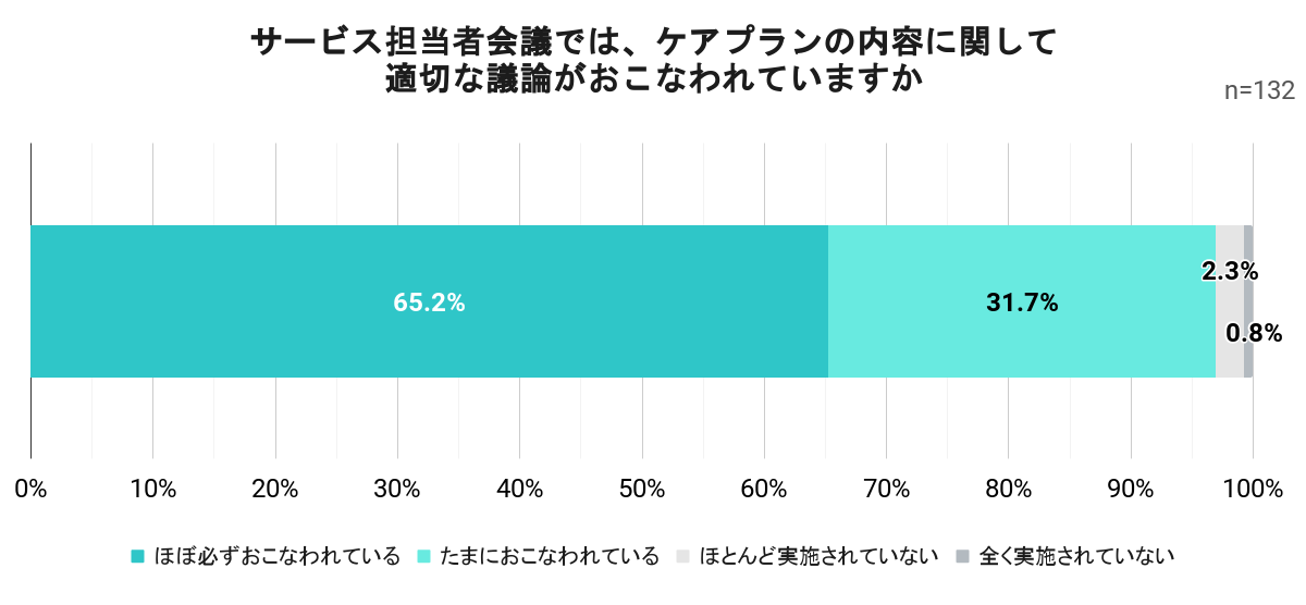 「サービス担当者会議では、ケアプランの内容に関して適切な議論がおこなわれていますか」という問いに対し、「ほぼ必ずおこなわれている」が65.2%、「たまにおこなわれている」が31.7%だった。