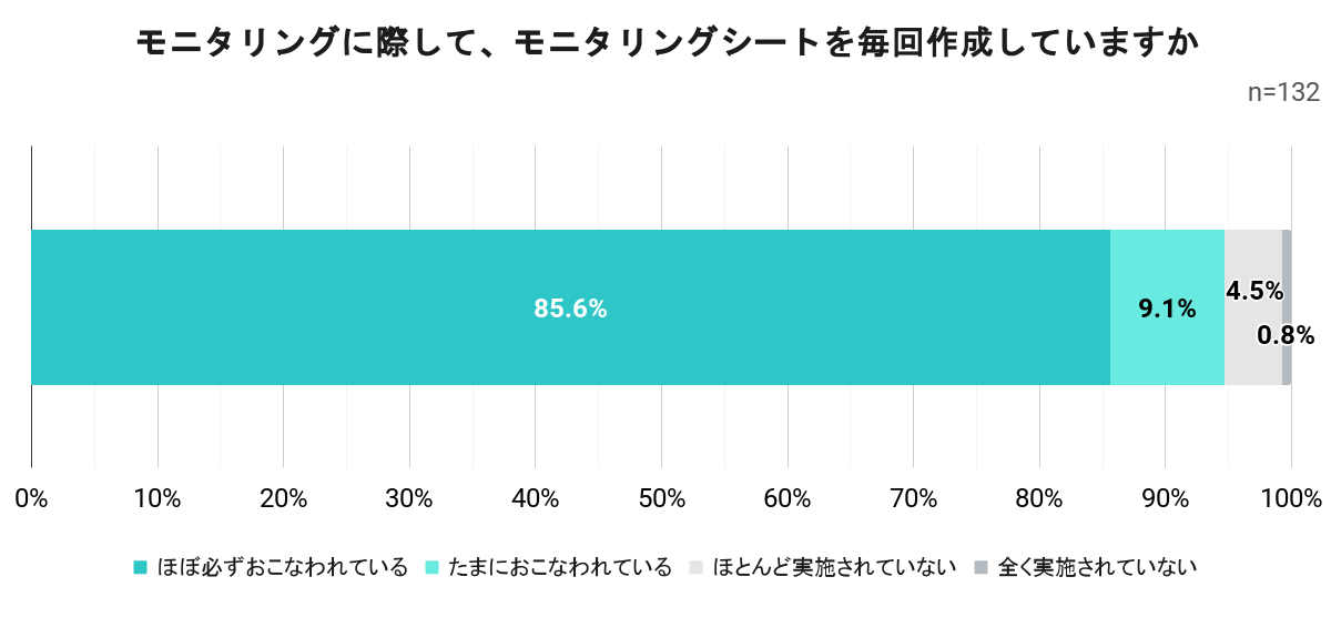 「モニタリングに際して、モニタリングシートを毎回作成していますか」という問いに対し、「ほぼ必ずおこなわれている」が85.6%だった。