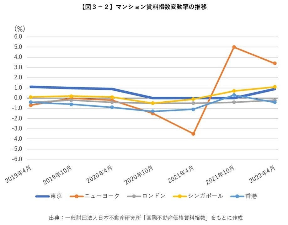 マンション市場でも、コロナ禍の被害が甚大であった「ニューヨーク」「ロンドン」では、都市封鎖など社会経済活動の自粛が影響し、マンション価格の下落基調がしばらく続きました。しかし、2021年10月以降オフィス出勤の再開によって都心部に居住環境を求める実需層が広がりを見せ、マンション価格・賃料は一転して大幅なプラスとなりました。同時期に東京でも、一時様子見だったマンション価格も再上昇し、一部地域では賃料も上り坂になっています。