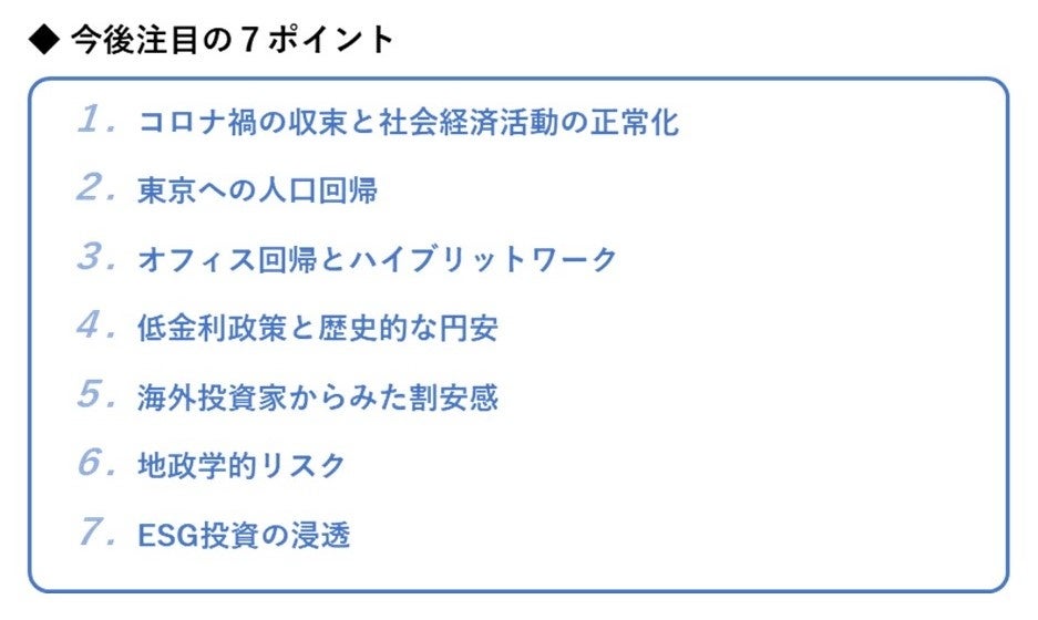 ここまで7つのポイントを解説してきました。激動の時代は続きますが、日本、とりわけ東京の不動産市場は、コロナ禍の収束と社会経済活動の再開、東京への人口回帰の流れ、低金利政策の継続、円安による海外からの投資の活発化などで、しばらくは底堅い動きが継続すると予測されます