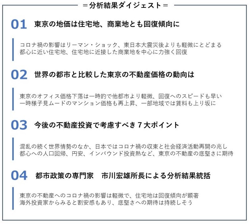 このたび同研究所では、調査・研究の第18弾として、東京と世界主要都市を比較した最新オフィス・マンション市況分析に加え、地価回復傾向における不動産投資の注目ポイントについて紹介します。