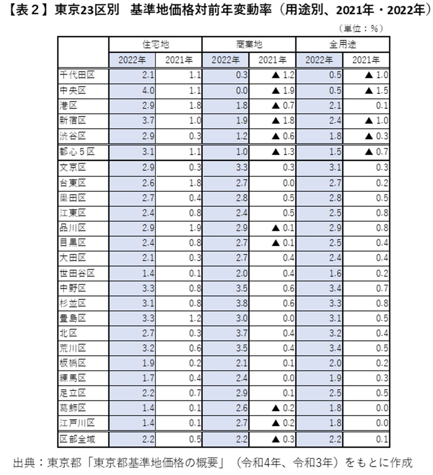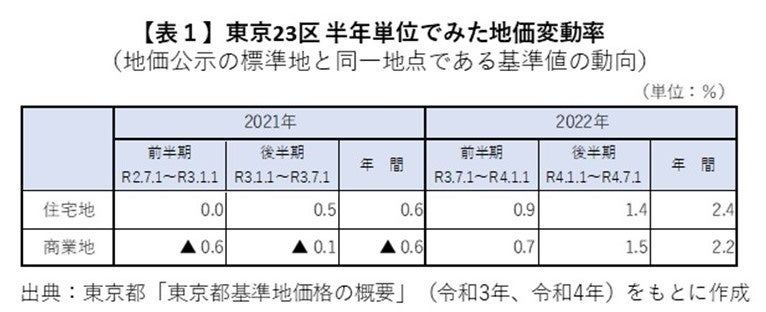 さらに、地価公示(毎年1月1日時点)の標準地と同一地点である基準地(共通地点)で、前半期(前年7月1日~1月1日)・後半期(1月1日~7月1日)に分け、東京都区部の地価変動率を半年単位でみた場合、住宅地では、2021年前半期0.0%→後半期0.5%→2022年前半期0.9%→後半期1.4%、商業地では、2021年前半期▲2.1%→後半期▲0.1%→2022年前半期0.7%→後半期1.5%となっています。コロナ禍による地価下落は、住宅地では2021年前半期に、商業地では2021年後半期にすでに底打ちしていたことが分かります【表1】。