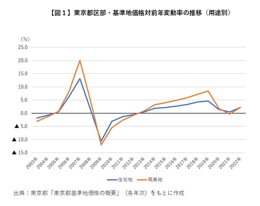「東京都基準地価格の概要」(東京都)によると、東京都区部では住宅地が2.2%上昇(前年0.5%)と上げ幅を拡大し、商業地が2.2%上昇(前年▲0.3%)とプラスに転じています。ここ20年間の動向を見て分かるように、リーマン・ショックや東日本大震災の影響を受けた2009~2012年の下落状況と比べ、ここ3年間のコロナ禍の影響は軽微であったと言えるでしょう【図1】。