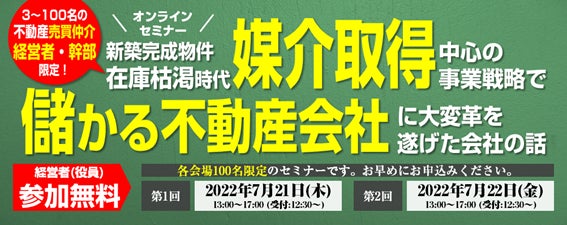 株式会社ZitzGen(所在地:東京都中央区、代表取締役社長執行役員 吉本大起、※読みがな:ジツゲン)は不動産売買仲介事業者を対象に、新築完成物件在庫が枯渇している不動産業界で生き残るための経営戦略と具体的な取り組みを解説する『媒介取得中心の事業戦略セミナー(物件在庫枯渇時代、媒介取得中心の事業で儲かる不動産会社に大変革を遂げた会社の話)』を開催いたします。開催日時は、2022年7月21日(木)、22日(金)で、両日程オンライン上で開催する予定となっております。