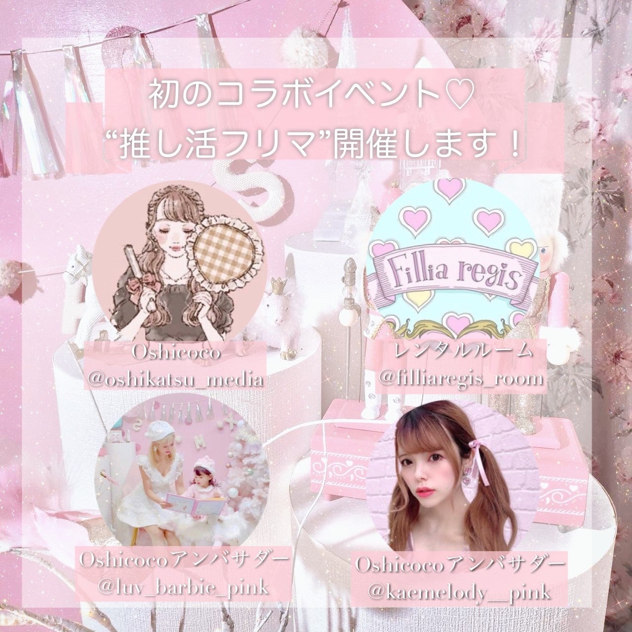 「推し活フリーマーケット」とは、「推し活応援メディアOshicoco」と「レンタルルーム filliaregis room」がタッグを組み、OshicocoのアンバサダーやSNSで人気のインフルエンサーとともに開催する史上初の「推し活」がテーマのコミュニティイベントです。インフルエンサーの累計フォロワー数は約50万人にも上ります。