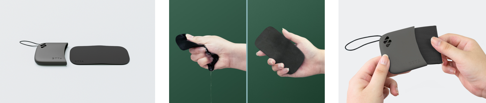 この産業用の吸水素材を使用し、身近な吸水アイテムを開発できないかという想いから、フラッグシップデザインカンパニーのkenmaとタッグを組み、1年半以上の開発期間をかけ、「ソフラス」を一般向け商品『STTA』として姿を変えて発売いたしました。