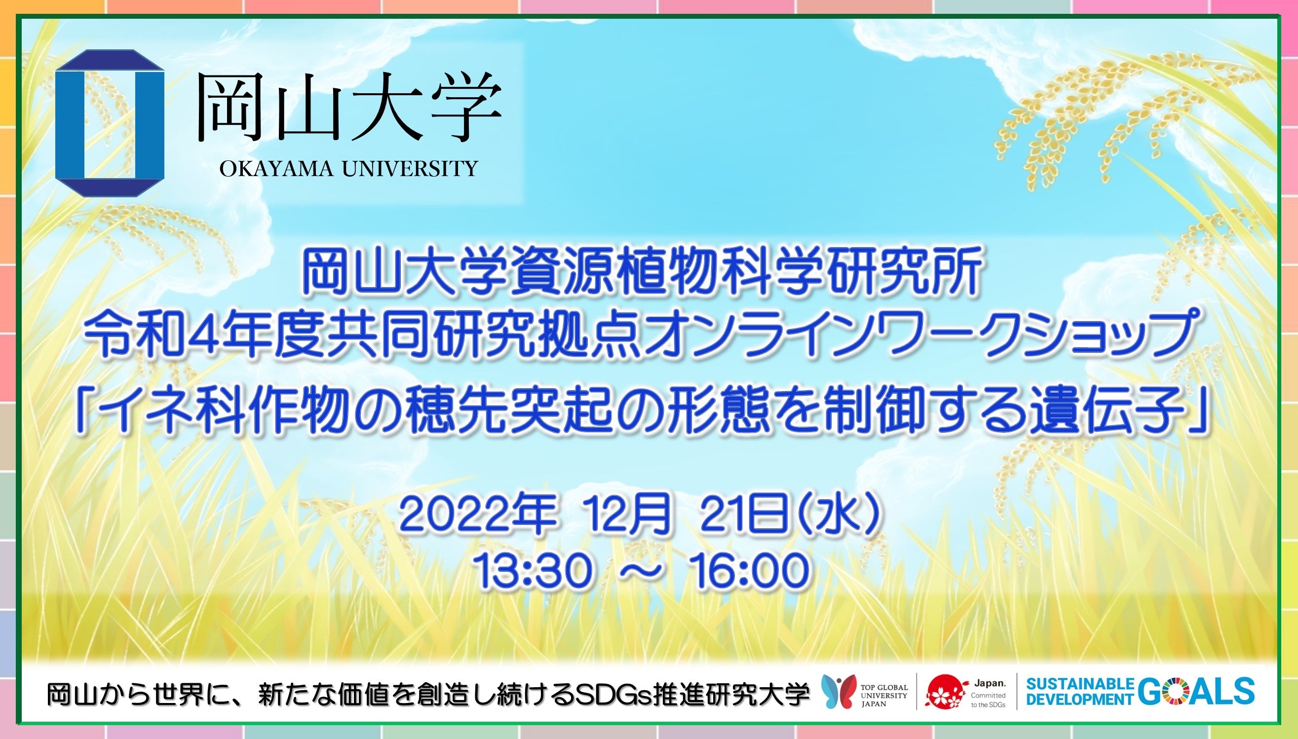 国立大学法人岡山大学(本部:岡山市北区、学長:槇野博史)の資源植物科学研究所では、令和4年度共同研究拠点オンラインワークショップ「イネ科作物の穂先突起の形態を制御する遺伝子」を 2022年12月21日(水)に開催します。