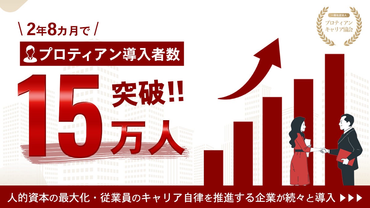現代版プロティアンは、経営戦略、事業戦略、人材戦略をつなぐ最先端のキャリア知見として大企業を中心に導入が進んできました。協会設立当初かかげていた3 年で10万人に届けるという目標をこえ、今回15万人導入の達成をお知らせする運びとなりました。心から感謝しています。
