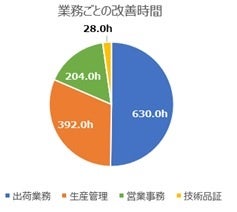 主な改善業務としては各拠点の出荷業務にて発送明細書をバーコード読み取りし、手作業で行っていた作業をRPAで自動化することで630時間、生産管理事務作業の入力業務の自動化で392時間、営業事務では紙媒体であるFAXを電子化(ペーパーレス化)し、AI-OCRと RPAを連携した処理にしたことで204時間となります。さらに、間接部門の従来の作業をRPAに置き換えることでテレワーク環境整備にも大きく寄与しました。