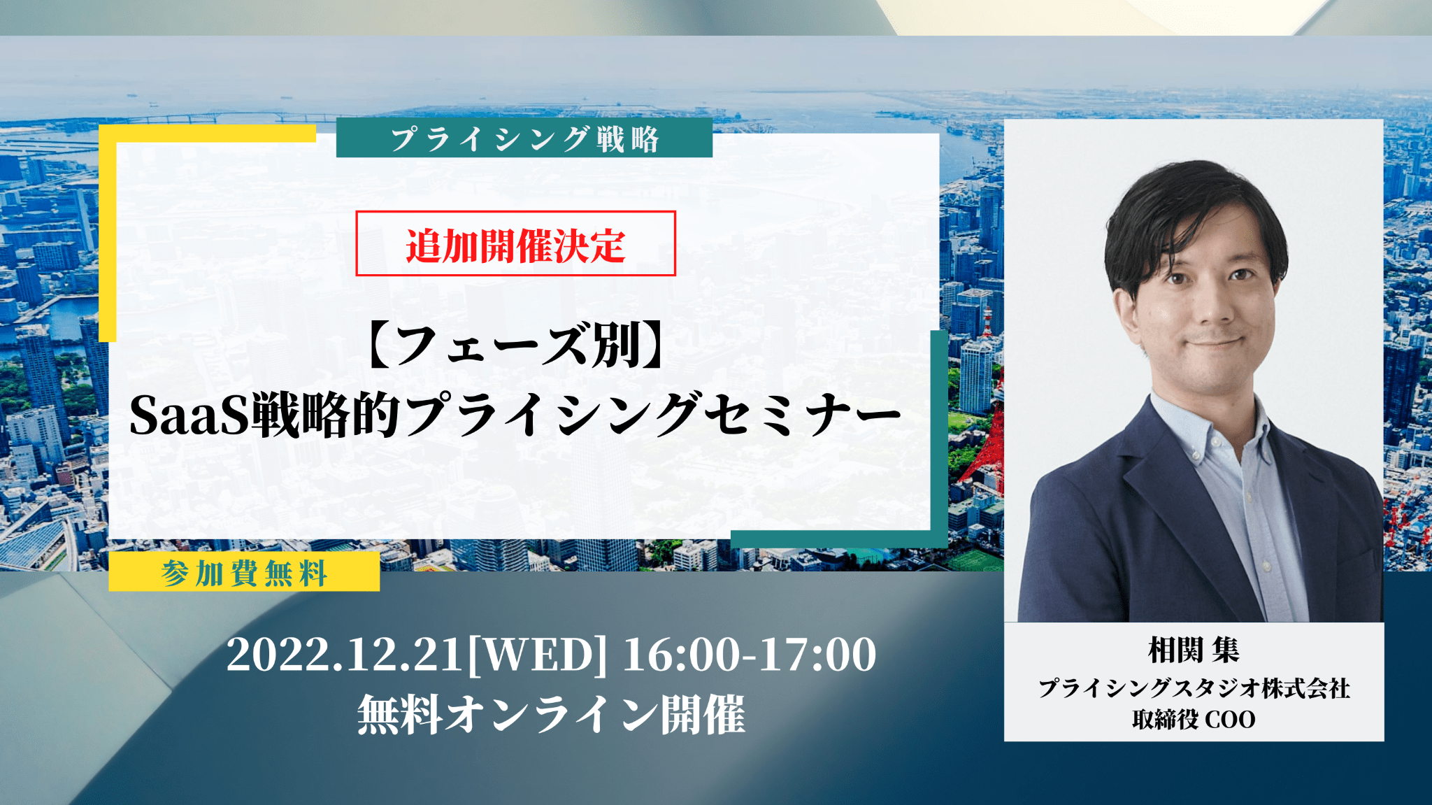 プライシングスタジオ株式会社(本社:東京都港区、代表取締役:高橋 嘉尋)は、無料オンラインセミナー【フェーズ別】SaaS戦略的プライシングセミナーを12月21日(火)16時に開催いたします。