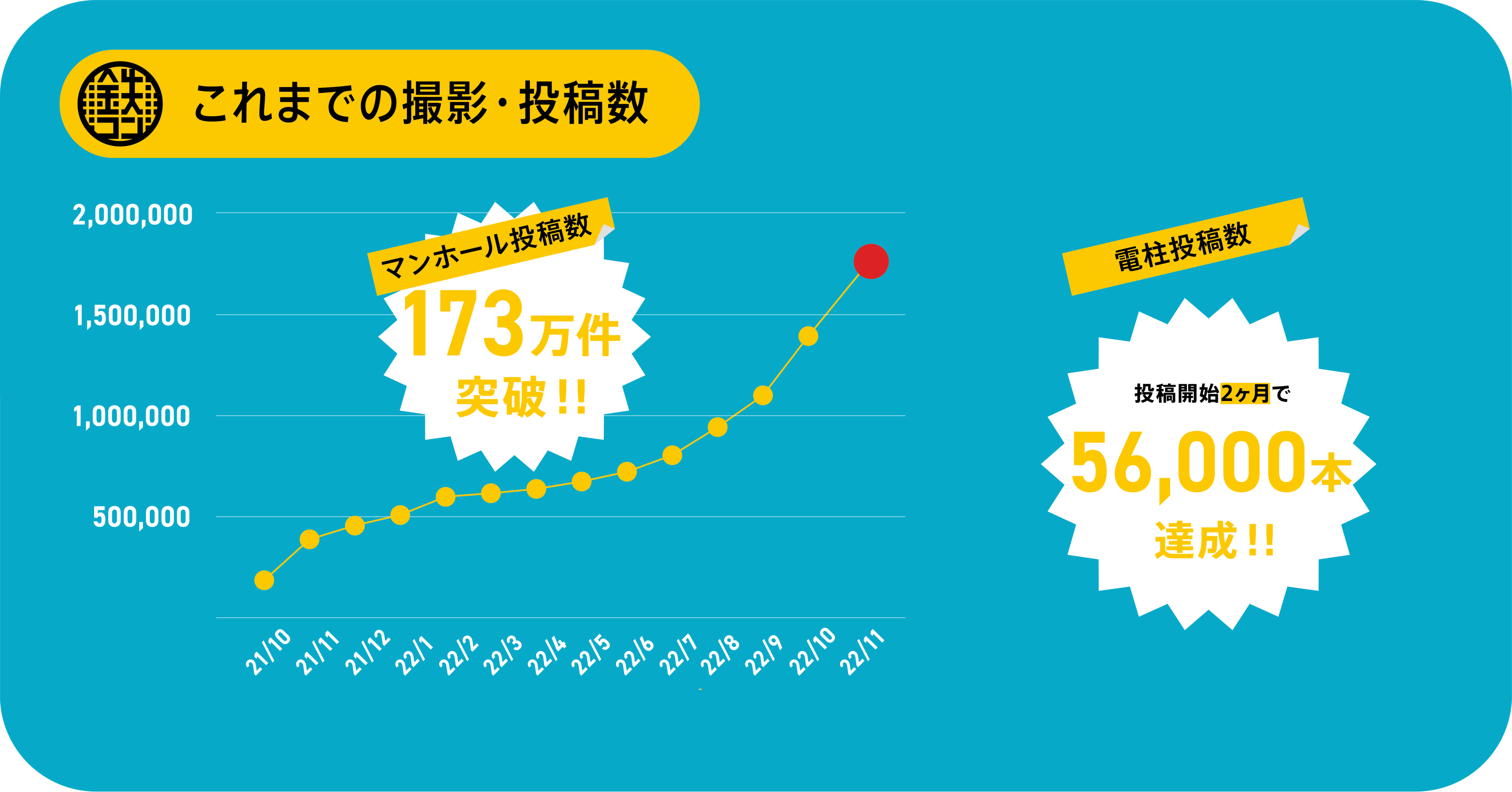シチズンが日常生活の中で行う鉄活のほか、2022年11月からはイベント・TEKKONインフラ聖戦が全国各地で開催されていることから短期間で集中的にデータが投稿される機会が増え、データ収集のスピードはさらに加速しています。現在は全世界のマンホールデータが173万枚以上も投稿されています。電柱も撮影対象に追加されてから2ヶ月で、既に56,000本以上のデータが投稿されました。