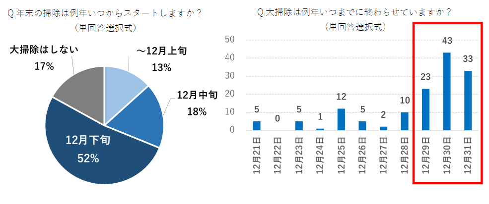 - 12月下旬に大掃除を開始する人が過半数。終わらせる日は30日が最多。