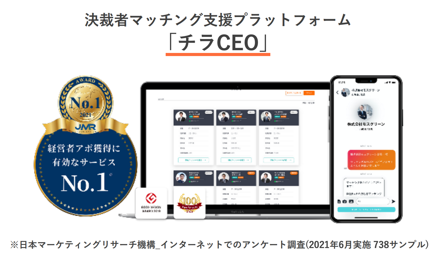 「チラCEO」は、決裁者マッチングを通じて経営課題を解決するサービスです。6000を超える決裁者が登録する独自プラットフォームを基盤とし、「メッセージ機能」「オンラインイベント」「専任CS(カスタマーサクセス)メンバーによる紹介」「掲示板機能」によって決裁者同士のマッチングを創出します。