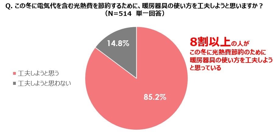 冬本番を迎えるにあたり、この冬に光熱費節約のため暖房器具の使い方を工夫しようと思うか伺ったところ、暖房器具を使用している人のうち85.2%もの人が「工夫しようと思っている」と回答しました。暖房器具による節約・節電方法に多くの人が関心を寄せていると思われます。