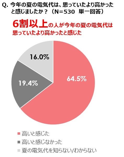 今年の夏の電気代が思っていたより高かったと感じた人は6割以上