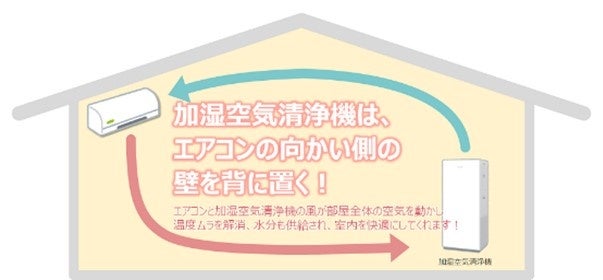 暖かい空気は上昇する性質があるため、室内の天井側と床側には温度ムラができやすくなります。一般的にエアコンの温度センサーは室内機にあり、天井側の空気が設定温度に到達すると、床側がまだ暖かくなっていなくても運転を弱めてしまいます。こうした場合にエアコンの設定温度を上げて床側を暖めようとすると、その分、消費電力が増加します。空気清浄機、サーキュレーター、扇風機などで天井と床の空気を撹拌し、温度ムラを抑えましょう。特に加湿空気清浄機を使用すれば、空気の撹拌と加湿、空気清浄を同時にできるので一石二鳥です。