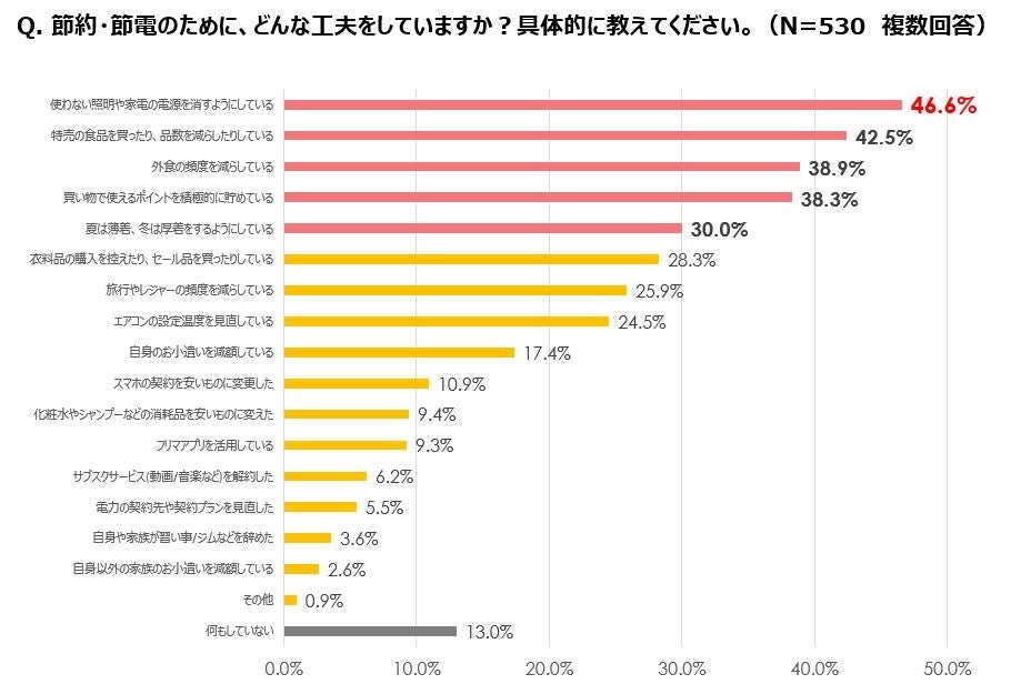 節約・節電のために実際に行っている具体的な工夫を聞いたところ、最も多かった回答は「使わない照明や家電の電源を消すようにしている」(46.6%)でした。このほか上位には、「特売の食品を買ったり、品数を減らしたりしている」(42.5%)、「外食の頻度を減らしている」(38.9%)、 「買い物で使えるポイントを積極的に貯めている」(38.3%)、「夏は薄着、冬は厚着をするようにしている」(30.0%)などが挙がりました。日常の生活の中で少しでも支出を抑えようという様々な工夫が行われていることが見られます。