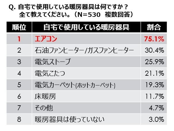冬に使用する暖房器具には様々なものがありますが、自宅で使用している暖房器具を聞いたところ、75.1%の人が「エアコン」と回答しました。