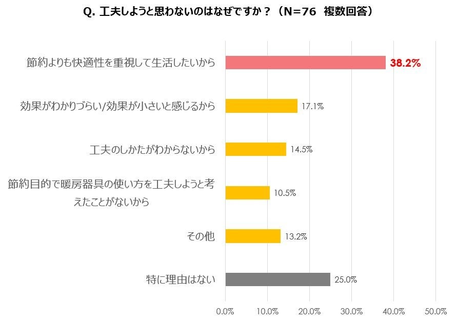 一方で、「工夫しようと思わない」(14.8%)と答えた人に対し、その理由を聞いたところ、「節約よりも快適性を重視して生活したいから」(38.2%)が最も多い理由で、次いで「効果がわかりづらい/効果が小さいと感じるから」(17.1%)、「工夫のしかたがわからないから」(14.5%)という回答が挙がりました。