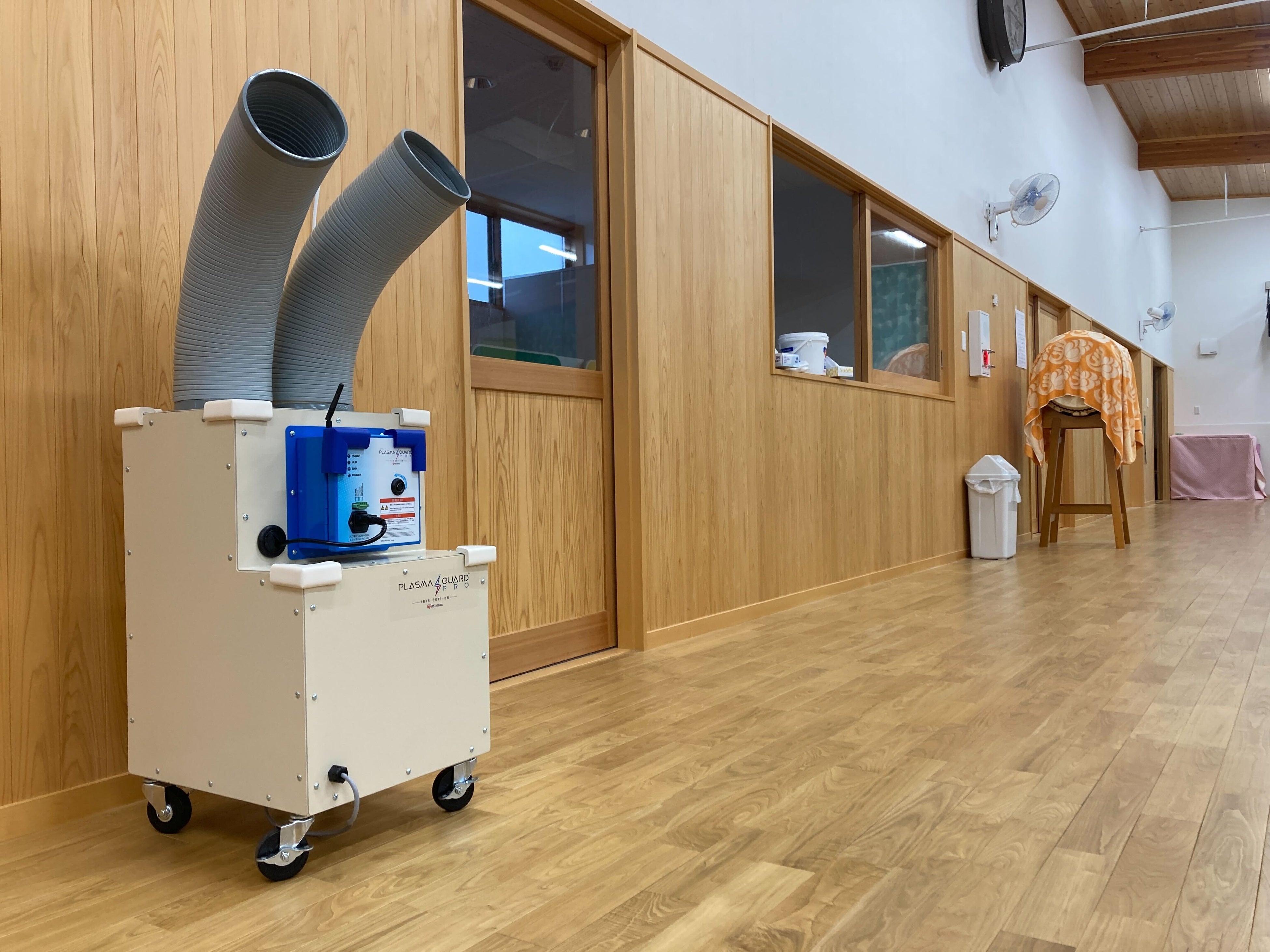 「PlasmaGuard PRO™ アイリスエディション」は、独自の低温プラズマ技術で発生するイオンにより、空間のウイルスを99.9%除菌する※大規模空気清浄化技術を採用しており、今回ホールに設置した置型可搬タイプは、AC100V電源を使用できるので工事も不要です。