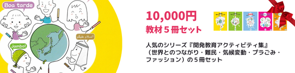 開発教育や参加型学習にこれから取り組む方にもおすすめの『開発教育アクティビティ集(世界とのつながり・難民・気候変動・プラごみ・ファッション)』5冊をセットにしてビギナーや若手にプレゼントするプログラムです。