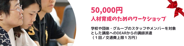 学校や団体・グループのスタッフやメンバーを対象とした講座へのDEARからの講師派遣(1回/交通費上限1万円含む)をプレゼントするプログラムです。未来の実践者を応援することができます。