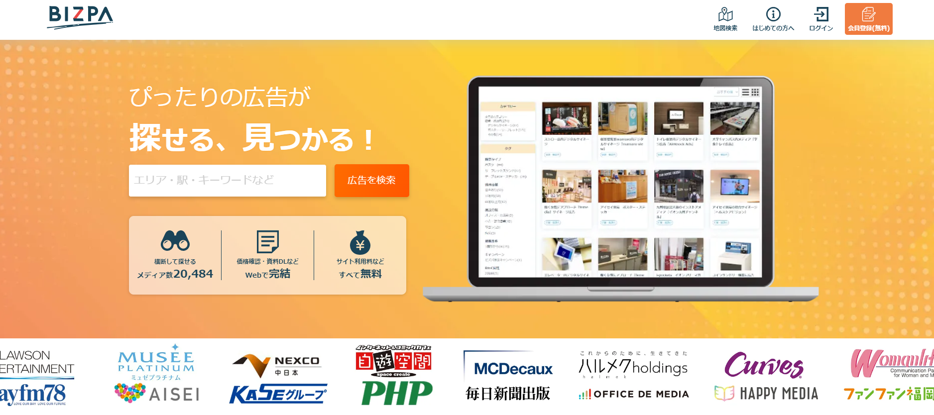 当社は広告メディアの検索プラットフォーム「BIZPA(ビズパ)」を2020年8月より正式運営しています。ビズパには看板・デジタルサイネージ・紙媒体・交通広告・WEB広告など多様な広告メディアが掲載されています。予算・ターゲット・最寄駅・地図など様々な条件で検索でき、自社に最適な広告を効率的に探すことができます。商品の特徴・価格・属性のグラフなどWEBから確認でき、見本誌・媒体資料などもダウンロード可能。ビズパを通じて媒体社との直接取り引きができ、適正な価格での取引や小ロットでの取引が可能です。