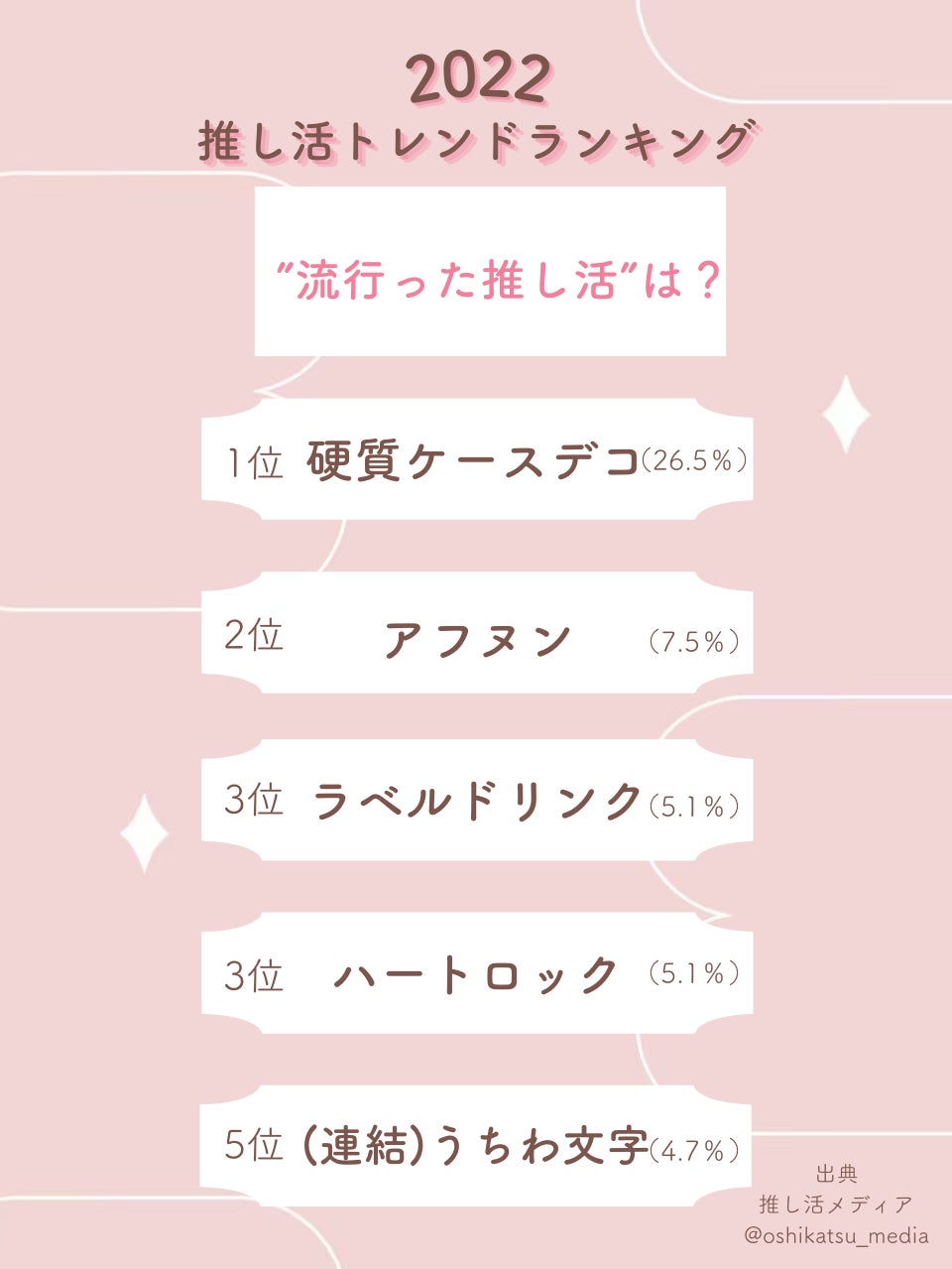 堂々の1位は「硬質カードデコ」。硬質カードケースをレジンやホイップ、レースなどでデコり、推しのトレカやL版写真を持ち歩くことが一般的になってきています。“Y2K”(2000年代に流行っていたカルチャーやファッション)が流行してるところから、“デコる”という行為自体がZ世代を中心とした若者の中で人気の推し活となっています。11月にOshicocoで開催したPOPUPでは商品としてトレカデコケースを販売。初日から大人気の商品となりました。