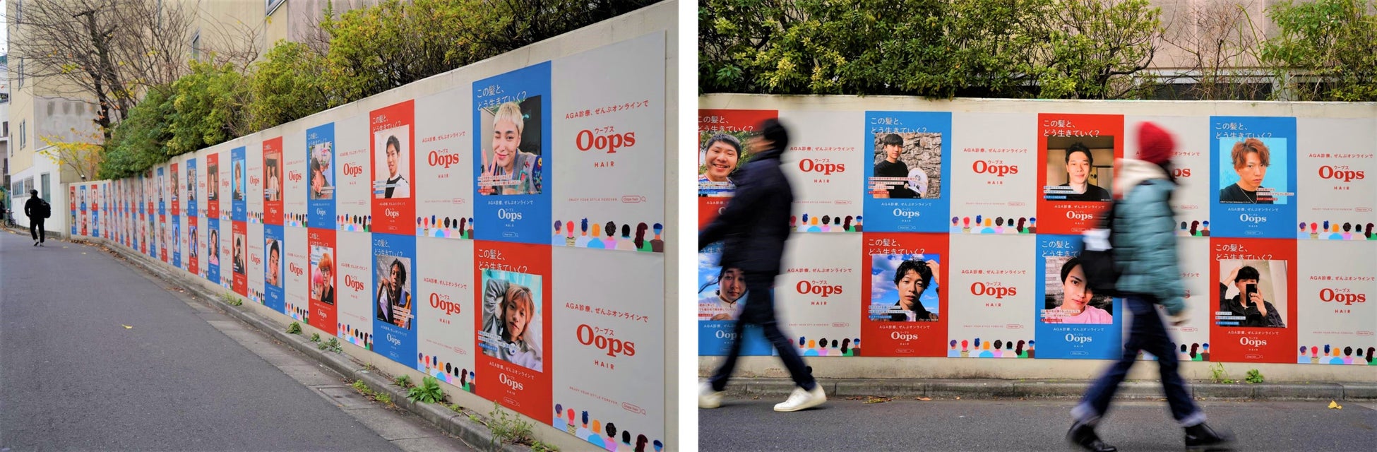 今回のプロジェクトでは、そんな「Oops HAIR」の持つ”AGA対策は美容ケアであり、服用しても恥ずかしくない、飲む瞬間もちょっと前向きになれるもの”という価値観を広めるため、総勢18名のインフルエンサーにご参加いただき、渋谷駅周辺・品川自由通路に屋外広告を掲出します。お笑い芸人やモデル、パフォーマーなど、「Oops HAIR」のサービスに共感いただいた、ジャンルを超えた様々な方が、自分の髪への思いを自分らしい写真とともに発信。AGA対策がより身近でカジュアルなものと知っていただくことで、早期治療を行うことがとても重要であるAGA診断・治療を受けやすい世の中を醸成していきます。
