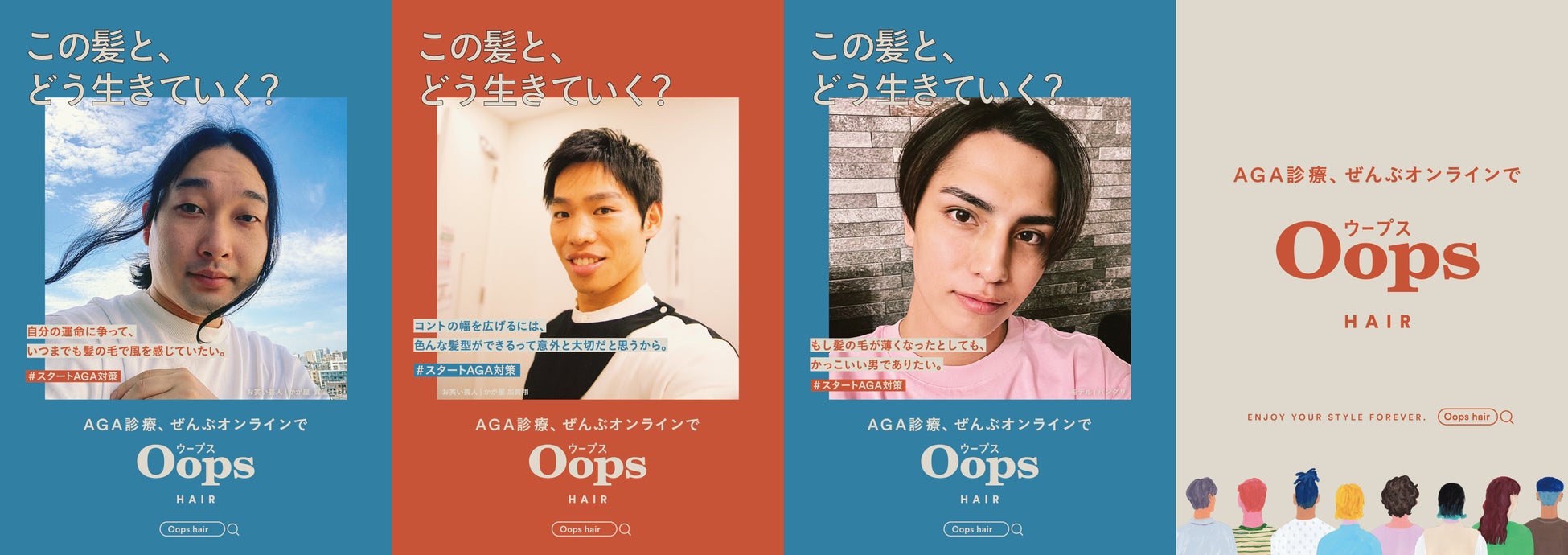 株式会社SQUIZ(東京都目黒区駒場)が展開するAGAのオンライン診療サービス「Oops HAIR」は、この度「この髪と、どう生きていく?#AGA対策」プロジェクトを実施いたします。総勢18名のインフルエンサーにご参加いただき、渋谷駅周辺・品川自由通路に屋外広告を掲出。参加いただく方々には自分の髪との向き合い方をそれぞれのSNSアカウントから発信していただきます。