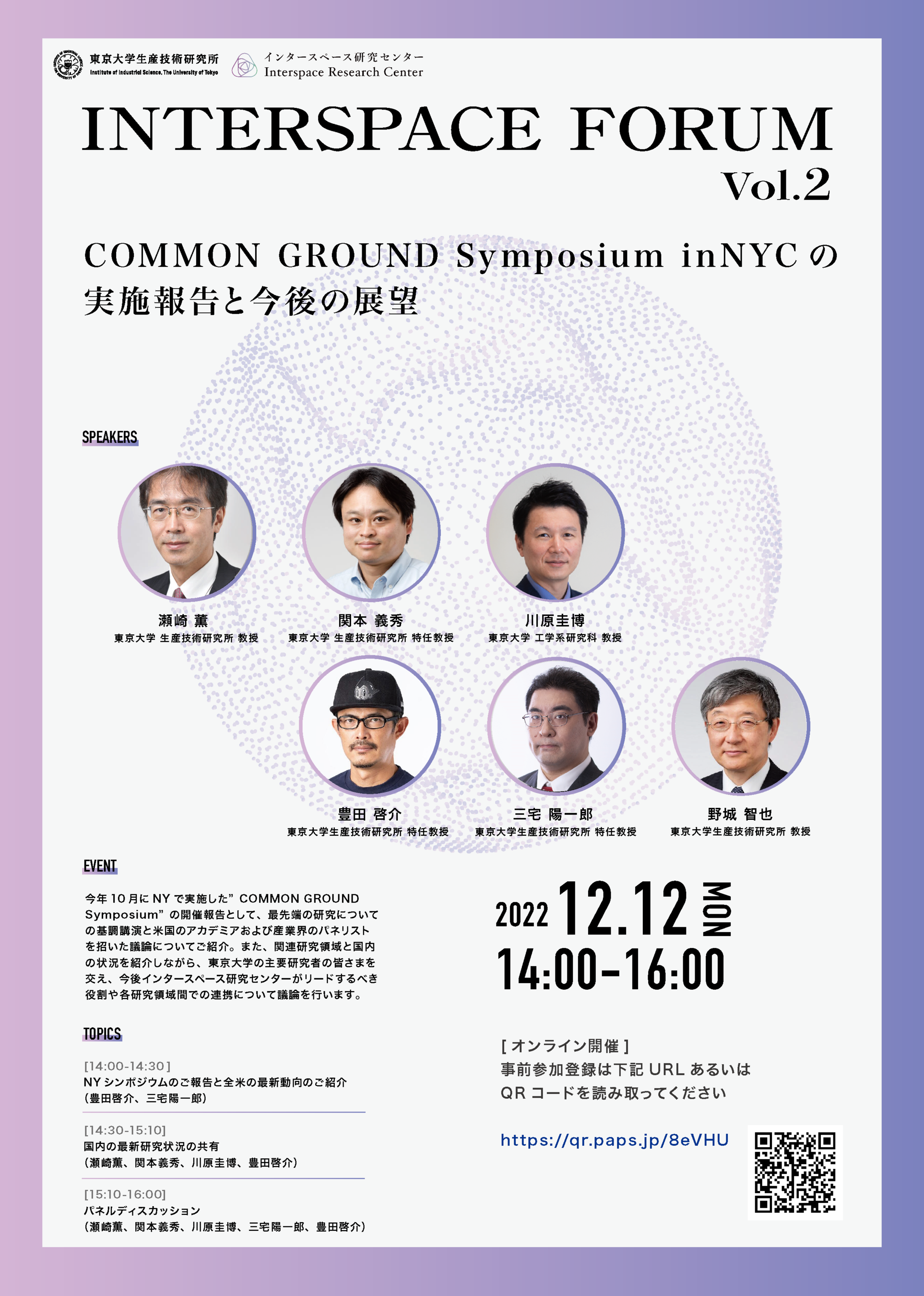 2022年10月に実施された”COMMON GROUND Symposium in NYC”では、インタースペース研究センターより野城 智也教授(センター長)、豊田 啓介特任教授、三宅 陽一郎特任教授の3名が登壇いたしました。