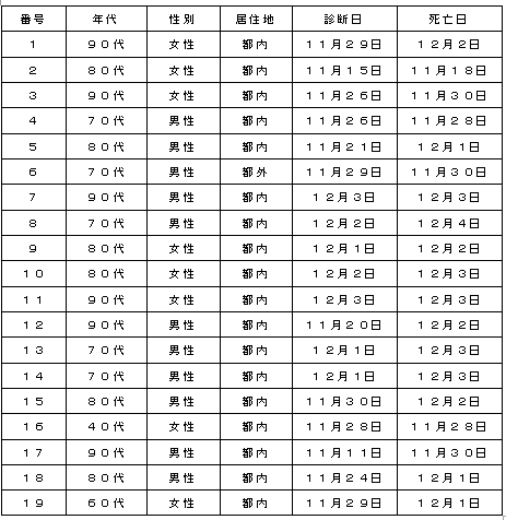 新型コロナウイルスに関連した患者の死亡について business Twitter Facebook はてブ Pocket LINE コピー 2022.12.05 この記事は約1分で読めます。 都内で新型コロナウイルスに感染した方が死亡されましたのでお知らせします。 お亡くなりになった方のご冥福をお祈り申し上げます。 1 新型コロナウイルスに関連した死亡者(本日公表分) 2 新型コロナウイルスに関連した死亡者の累計 6,277人