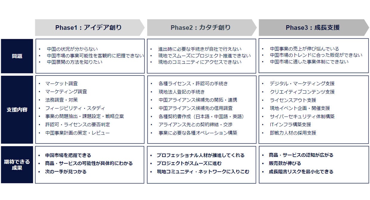 また、中国事業を推し進める日中ビジネス即戦力人材の採用、中国におけるサーバやITインフラの構築、中国弁護士資格を持つコンサルタントに中国の情報セキュリティ対策・法規制対策など、立ち上げだけではなくその後の事業本格化に関しても支援を実施いたします。