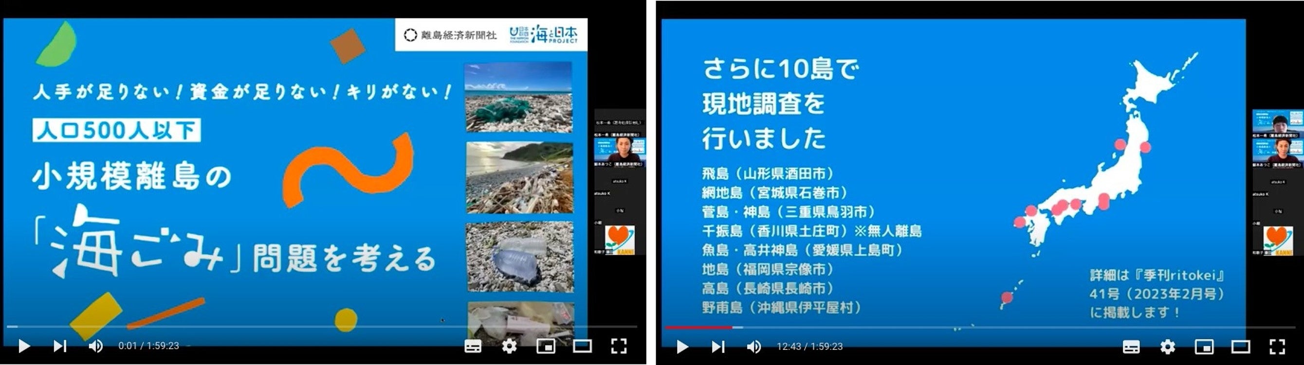 2022年11月25日(金)に開催されたオンラインイベントでは、離島経済新聞社代表・統括編集長の鯨本あつこが司会を務め、小規模離島地域101島のアンケート調査結果と10島での現地調査に携わったリトケイ編集部の松本一希が調査結果について報告。海洋ごみの課題を抱える小規模離島3地域(地島・人口約130人/魚島・人口約120人/浮島・人口約180人)より地域の実情について語っていただきました。また、海洋ごみ対策の先進事例として、離島地域の海洋ごみ問題に取り組む3名のゲストに日頃の活動を発表していただきました。