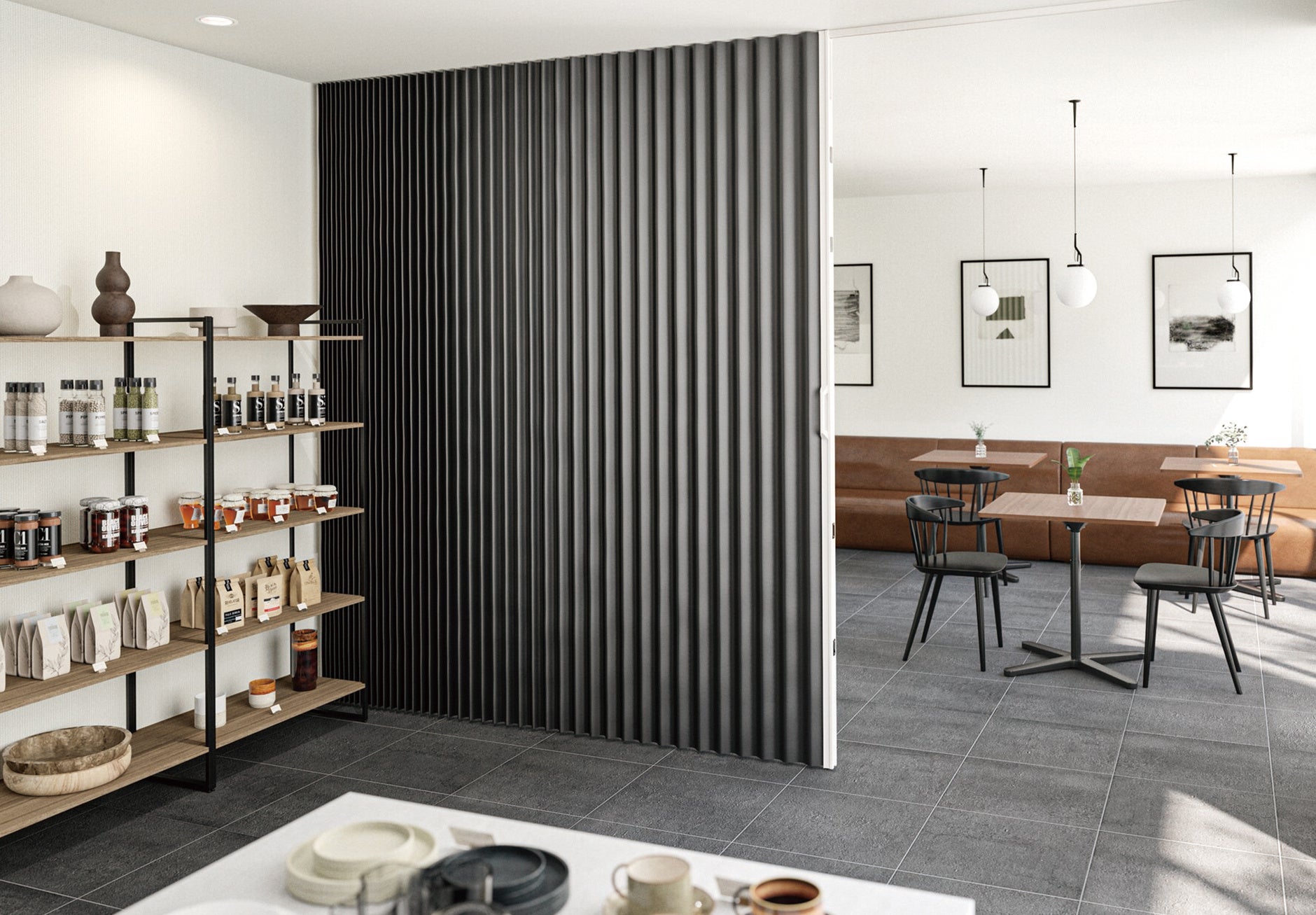 「アコーデオンカーテン」は、シンプルなヨコ引き操作の間仕切りです。空間を仕切るだけでなく、ワークス